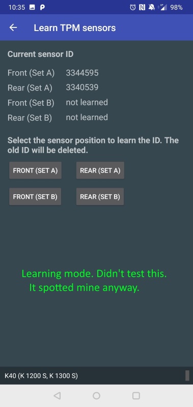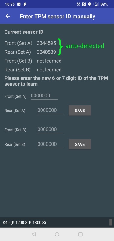 TPMSTPMS can be done by 'learning', or by manually entering the details. You can delete them too.