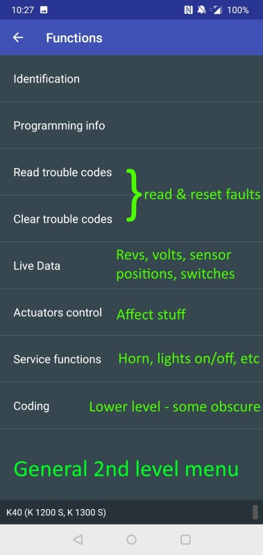 - 2nd level: read live data, read settings, play with 'actuators', send control codes (whatever they might be)